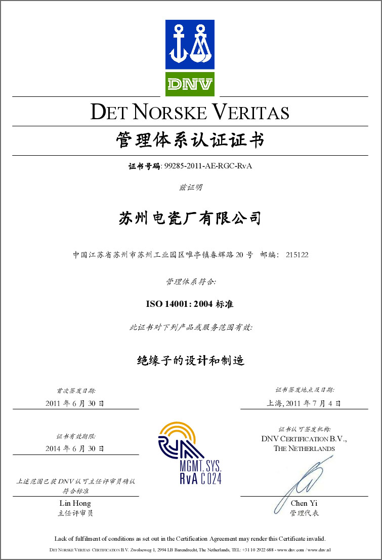 最近,公司控股子公司蘇州電瓷廠有限公司通過了挪威船級社(DNV)頒發(fā)的兩項管理體系認(rèn)證:分別是ISO14001:2004環(huán)境管理體系認(rèn)證,和OHSAS18001:2007職業(yè)健康及安全管理體系認(rèn)證。